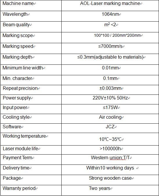 AOL-Laser marking machine mark on metal and a variety of non-metallic materials, especially suitable for some occasions of detailed requirements and high precision. It is used in electronic components, hardware tools, accessories, integrated circuit (IC), electrical appliances, mobile communications, precision instruments, spectacles and clocks, jewelry, auto parts, plastic buttons, construction material, PVC pipe, medical equipment and other industries.